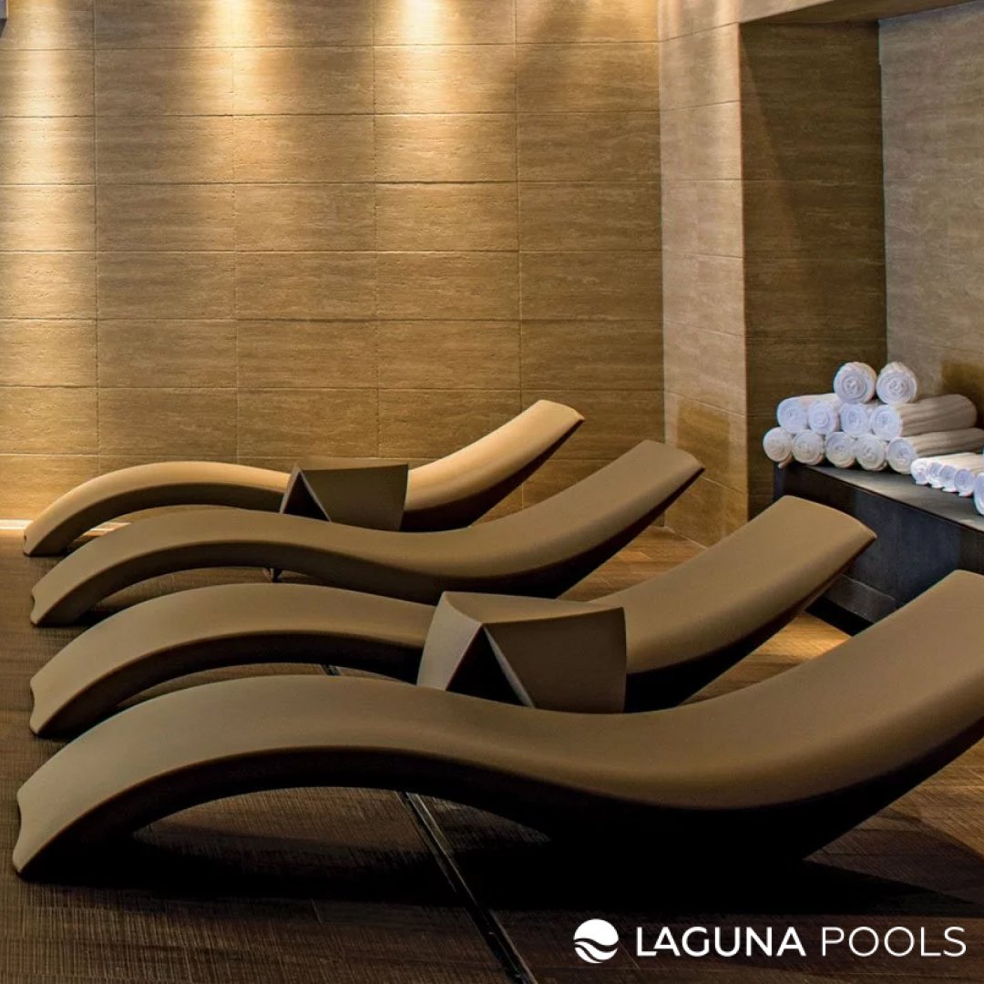 Шезлонги бежевого цвета на фоне плитки и деревянной отделки с аккуратными белыми полотенцами.